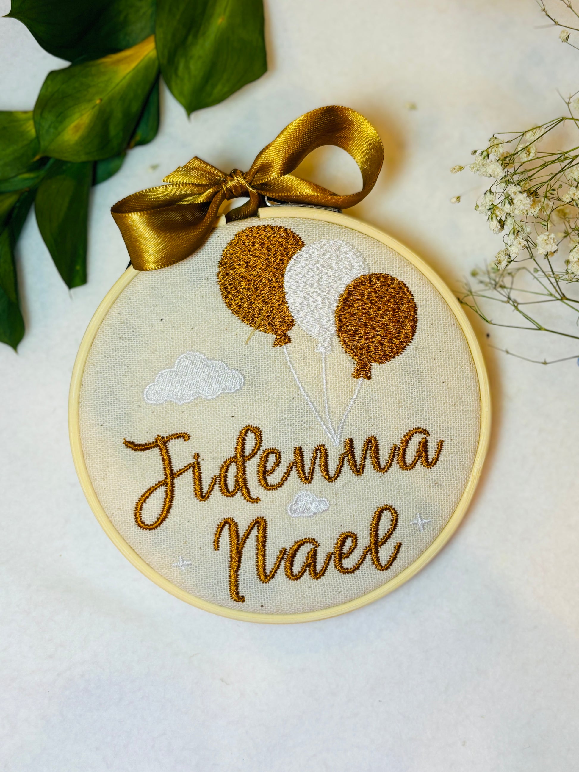 A embroidered baby name hoop, perfect for nurseries, baby showers, or newborn photos. Each piece is customized with your child’s name and framed in a wooden hoop for a timeless keepsake.