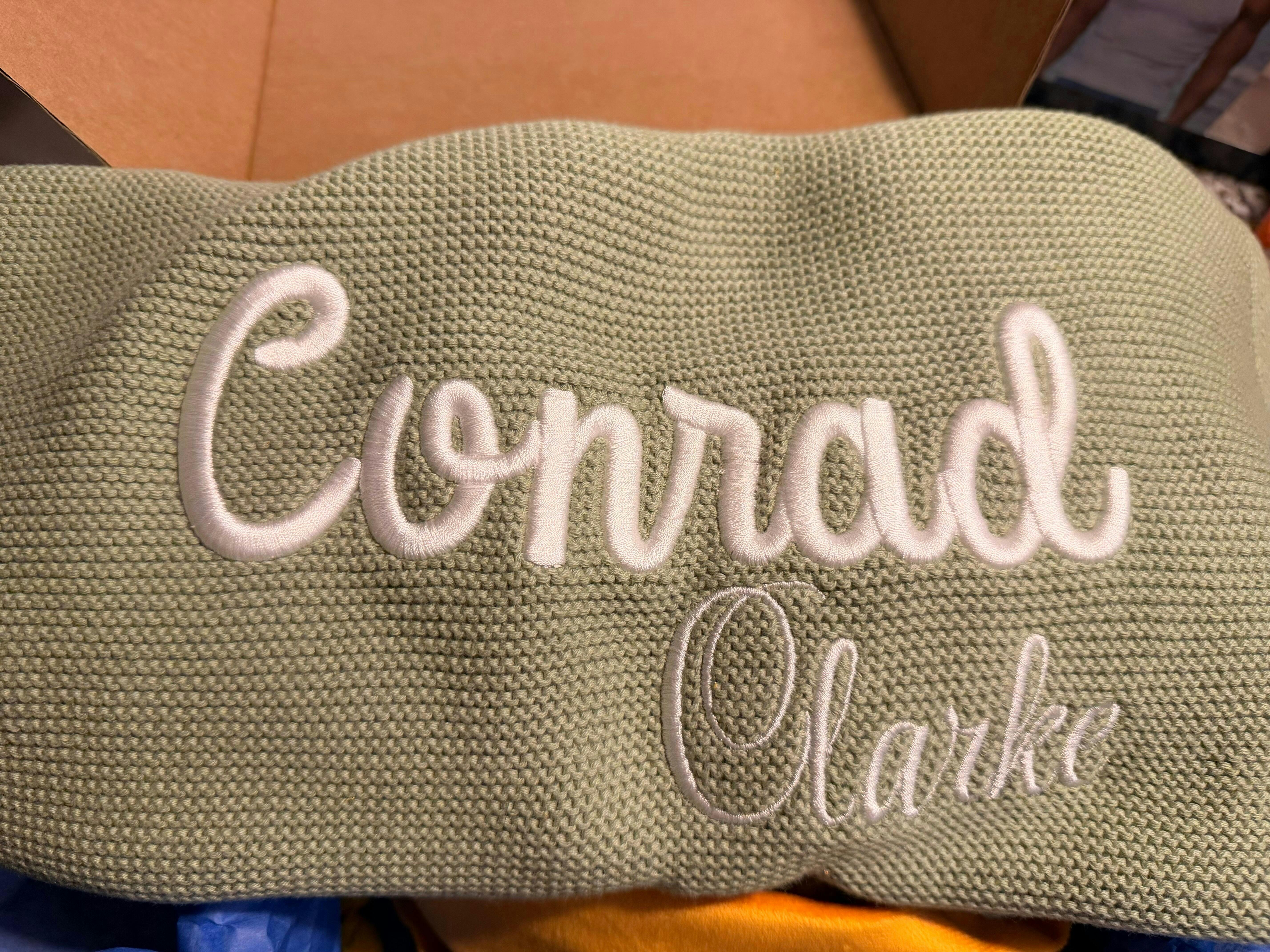 This beautifully knitted blanket features your little one’s name in raised 3D embroidery for a cozy, one-of-a-kind keepsake.