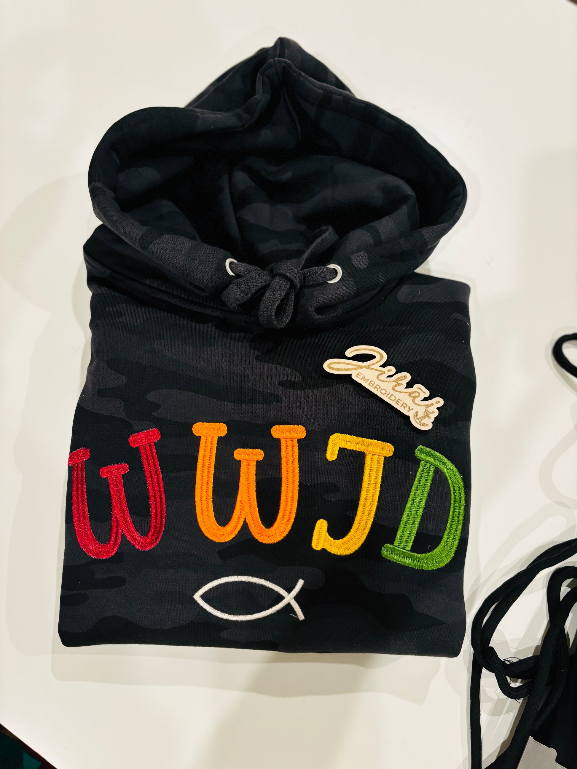 The WWJD Camo Hoodie blends bold streetwear style with a faith-centered message. Designed with a classic camouflage base and clean embroidered lettering, this hoodie makes a statement without saying too much-inviting reflection through the timeless question: What Would Jesus Do?